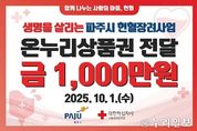 (누리일보) 파주시는 지난 1일 대한적십자사 서울중앙혈액원에 1천만 원 상당의 헌혈장려지원금 상품권을 전달했다. 시는 안정적인 혈액 공급 기반을 마련하고 지역사회 내 헌혈 참여문화를 확산하기 위해 지난달 헌혈추진협의회를 구성 회의를 개최했으며, 회의 결과에 따라 관내 헌혈자 대상 인당 1만 원 상당의 온누리상품권을 지급할 예정이다. 특히 파주시는 말라리아 헌혈 제한 지역으로, 관내 헌혈의집이 없어 헌혈버스를 통해서만 헌혈이 가능하고 동계기간인 11월~3월에 한해 전혈헌혈이 허용되는 등 여러 제약이 있다. 이러한 어려운 여건 속에서도 시민들의 헌혈 참여를 확대하기 위해, 국내 말라리아 헌혈 제한 지역 중 최초로 헌혈장려금을 지원하게 됐다. 이한상 파주보건소장은 “헌혈장려지원금 지급이 혈액 수급 안정화와 헌혈 참여문화 확산에 기여하는 계기가 되길 기대한다”라고 밝혔다.