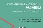 (누리일보) 경기도 수원시립미술관은 한국큐레이터협회와 함께 2025년 학술 세미나 '큐레이터 공동 연구와 협업-코퍼레이션 힙'을 주제로 12월 12일 오후 1시 수원시립미술관 행궁 본관에서 개최한다. 이번 세미나는 기관과 기획자 간 연구의 지평을 확장하는 담론의 장을 위해 수원시립미술관과 한국큐레이터협회가 업무협약을 체결하고 공동 연구와 협업 사례를 조명한다. 세미나는 “큐레이터 공동 연구와 협업-코퍼레이션 힙”을 주제로 김현숙 KISO미술연구소 소장이 한일 공동 연구 전시 사례로서 《한일 근대미술가들의 눈》의 연구 과정을 발표하며 세미나의 첫 문을 연다. 전북도립미술관 이애선 관장은 “빈손의 연대, 가득한 변화 – 연대는 선택이 아닌 책임”이라는 주제로 전라북도 소재 예술기관들의 협업과 연대 사례를 살펴보며, 이영준 김해문화관광재단 정책홍보팀장은 공동 연구와 협업 전시가 어우러진 사례로서 “문예회관 전시실, 협업과 연대로 풀어보는 대안들”을 발표한다. 2부에서는 한국화학연구원 고영주 전문경영위원이 “대전 과학예술 융합 사례”에 관한 연구를 공유하고, 박지영 독립큐레이터는 경남도립미술관에서 기획한 《실로 어마어마한 일이다》