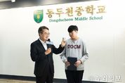 (누리일보) 김동연 경기도지사가 16일 동두천중학교를 찾아 노점 할머니께 비상금을 건넨 선행으로 화제가 된 옥현일 군에게 표창을 수여했다. 김 지사는 학교 현관에서 학생회와 함께 ‘함께라서 더 빛나는 우리’ 생명존중 캠페인에 동참하고, 이어 1층 로비에서 옥현일 군에게 표창장을 전달했다. 옥현일 군은 지난 7월 폭염 속에서 노점상 할머니에게 비상금 3만 원을 건네고 콩 한 봉지를 받은 사연이 알려지며 주목받았다. SNS에 게시된 영상은 인근 공방 운영자가 촬영한 것으로, 현일 군이 남모르게 베푼 선행이 담겨 3일 만에 206만 조회수, ‘좋아요’ 약 7만, 댓글 2,500개 이상을 기록했다. 당시 현일 군은 “더운 날씨에 할머니가 물건을 빨리 팔고 쉬셨으면 좋겠다는 마음이었다”고 말해 많은 시민에게 감동을 줬다. 김동연 지사는 이날 인사말을 통해 “옥현일 군이 도운 할머니가 우리의 어머니, 할머니”라며 “수많은 옥현일 군이 동두천중에 있다고 본다. 그것이 사람 사는 세상”이라고 말했다. 이어 “여러분이 그런 따뜻한 마음을 갖길 바란다. 당장은 남을 위한 배려 같지만 길게 봐서 인생에서