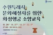 (누리일보) 수원특례시가 문화해설사를 대상으로 화성행궁 고증 연구 결과를 교육해 ‘연구 기반 문화해설’을 정착시킨다. 수원시는 11월 26~27일, 12월 3~4일 4회에 걸쳐 수원문화재단에서 ‘수원특례시 문화해설사를 위한 화성행궁 소양교육’을 한다. 유네스코독일위원회와 유네스코한국위원회가 지원하는 이번 교육에는 수원문화재단·수원화성박물관·수원청소년청년재단 등에서 수원화성과 화성행궁을 해설하는 문화해설사들이 참여한다. 화성행궁 고증 연구의 성과를 해설 현장에 연결하기 위한 교육이다. 연구를 수행한 전문가들이 강사로 나선다. 강의 주제는 ▲화성행궁의 변화와 이중적 기능(이선희 중앙대 교수) ▲1794년 화성행궁 중심 영역의 건축적 변화(이연노 건축문헌고고스튜디오 건축구조실장) ▲화성행궁의 발굴(이승연 건축문헌고고스튜디어 건축고고실장) ▲화성행궁 생활상 고증과 공간 재현(정정남 건축문헌고고스튜디오 대표) 등이다. 수원시는 화성행궁 2단계 복원을 추진하면서 건축물 외형 복원뿐 아니라, 내부 고증에 대한 연구의 필요성을 인식하고, 2023~2024년 ‘화성행궁 생활상 고증 및 재현 방안 연구’를 수행했다.