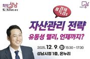 (누리일보) 성남시는 오는 12월 9일 오후 3시 30분~5시 30분 시청 1층 온누리에서 ‘자산관리 전략’을 주제로 한 올해 희망성남 토크콘서트 마지막 강연을 연다. 앞선 11월 19일 ‘부동산 전망과 내 집 마련 전략(고종완 한국자산관리연구원장)’에 이은 경제 특강 2탄이다. 이날(12.9) 초빙 강사는 김광석 한국경제산업연구원 경제연구실장이다. 강연자는 ‘유동성 랠리’와 빠르게 변화하는 경제 환경 속에서 국내외 주요 경제 현안에 대해 알기 쉽게 설명한다. 이와 함께 유동성 장세의 지속 여부, 실질적인 투자 운용 방향, 향후 경제전망, 자산관리 전략에 관한 강연을 한다. 김광석 실장은 ‘경제 읽어주는 남자’ 저자로 알려진 경제전문가다. 현재 한양대학교 겸임교수로도 재직 중이며, 에너지경제연구원 전문연구원, 현대경제연구원 선임연구원, 삼정KPMG 경제연구원 수석연구원 등으로 활동했다. 강연은 무료로 진행되며, 성남시 평생학습 통합 플랫폼 ‘배움 숲’ 홈페이지를 통해 선착순 600명까지 신청할 수 있다.