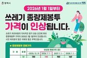 (누리일보) 평택시는 2026년 1월 1일부터 쓰레기 종량제 봉투 가격을 3개년도에 걸쳐 인상한다. 그동안 평택시는 인구증가, 물가상승, 생활 쓰레기 수집 운반 처리비용 증가에도 불구하고 2006년 이후 종량제봉투 가격을 동결해 왔다. 시 관계자는 “현재 평택시의 종량제 가격은 경기도 31개 시군 가운데 최하위 수준이며, 청소예산 재정자립도와 주민부담률이 낮아 가격 인상은 불가피하다”고 밝혔다. 따라서, 대표적으로 일반용 종량제봉투 20리터는 현재 500원에서 110원 인상된 610원으로, 음식물 전용 봉투 1.5리터는 현재 40원에서 20원이 인상된 60원으로, 공동주택에 설치된 음식물종량제기기(RFID)는 1㎏ 단위로 현재 48원에서 12원 인상된 60원으로, 경기도 내 31개 시군 평균 가격을 반영하여 인상안을 마련했다. 다만, 서민경제의 어려움과 시민부담을 고려하여 가격 인상은 3개년도에 걸쳐 단계적으로 시행할 예정으로, 시 관계자는 “종량제봉투 가격 인상에 대한 시민 여러분의 많은 이해와 협조를 부탁드린다”며 “앞으로도 쾌적하고 청결한 도시환경 조성은 물론 질 높은 청소행정 서비스 제공에