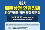 (누리일보) 민형배 의원(더불어민주당, 광주 광산을)이 마련한 '제2차 베트남전 인권침해 진실규명을 위한 국회 토론회'가 내일(25일) 오전 9시 30분부터 국회의원회관 제5간담회의실에서 개최된다. 이번 토론회는 베트남전 파병군인 인권침해에 대한 진실규명 문제를 논하는 최초의 공개 토론회이다. 지난 9월 30일 민형배 의원은 '베트남전쟁 시기 대한민국 국군에 의한 민간인 및 파병군인 등에 대한 인권침해 사건 진실규명특별법안'(민형배 의원 등 30명 공동발의, 이하 베트남전 진실규명법)을 발의했다. 이 법안은 한국군에 의한 집단학살 등 인권침해 사건뿐만 아니라 파병군인의 자살·전쟁 후유증 등을 조사 범위에 포함하도록 한다. 법안 발의에 이어 개최되는 이번 토론회에서는 베트남전 파병군인이 겪은 군 내부 폭력·자살·전쟁 후유증 등의 인권침해를 중심으로 논의한다. 양현아 서울대 법학전문대학원 명예교수가 사회를 맡고, 하미학살 피해생존자 응우옌티탄이 영상 발언을 통해 베트남전 진실규명법 제정을 국회와 시민사회에 호소한다. 노용석 교수(국립부경대학교)가 “베트남전 파병과 민주주의, 그리고 파병군인의 인권침해”를 주제