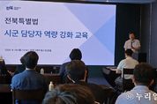 (누리일보) 전북특별자치도가 시군과 함께 전북특별법의 성공적 안착을 위한 실무 역량 강화에 나섰다. 도는 29일 전주 그랜드힐스턴호텔에서 도내 14개 시군 특례 담당 공무원 50여 명이 참석한 가운데 '전북특별법 시군 담당자 역량 강화 교육'을 실시했다. 이번 교육은 전북특별법의 본격적인 시행에 따라 시군별 특례 발굴을 활성화하고, 발굴된 과제를 법제화로 연결하기 위한 실무 능력을 높이기 위해 마련됐다. 이날 ▲전북특별법 및 특례 제도 심화 강의 ▲시군 사례 분석과 특례 발굴 전략 ▲조문 작성 절차 및 법제화 과정 등 실무 중심 내용으로 구성됐다. 특히 각 시군이 발굴한 과제와 애로사항을 공유하며 해결책을 모색하는 토론도 이어졌다. 전북특별자치도는 앞으로도 시군 담당자 대상 실무 교육을 정례화해 역량을 지속적으로 강화하고, 발굴부터 법제화까지 이어지는 도-시군 협업 시스템을 공고히 해 나갈 계획이다. 또한 우수 사례를 적극 발굴·전파해 모든 시군이 균형 있게 발전할 수 있도록 지원한다는 방침이다. 강영석 특별자치교육협력국장은 “전북특별법의 성공적인 안착은 도와 시군이 함께 만들어가는 과