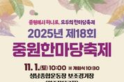 (누리일보) ‘제18회 중원한마당축제’가 오는 11월 1일 오전 10시부터 오후 2시 30분까지 2000여 명이 참석한 가운데 성남종합운동장 보조경기장에서 열린다. 성남시 중원구가 후원하고, 중원한마당축제 추진위원회가 주최·주관해 열리는 이번 행사는 ‘중원에서 하나로, 모두의 한마당 축제’를 주제로 진행된다. 이날 특설무대에선 11개 동 주민 대표가 출연해 넘치는 끼와 노래 실력을 선보이는 ‘우리 동네 인기스타’ 공연이 펼쳐진다. 초청 가수 윤수현의 ‘천태만상’ 등 트로트 공연, 신인 아이돌 걸그룹 아스텔의 ‘슈퍼노바’, ‘아일랜드’ 등의 공연, 중원유스센터 청소년 보컬 동아리와 댄스 동아리 공연도 열려 축제 분위기를 달군다. 시민 체험 행사도 다양하다. 행사장 곳곳에 총 11개 체험 부스를 설치해 4차산업과 관련한 드론 축구, 가상현실(VR) 트럭 체험, 배틀 로봇 등과 페이스페인팅, 목공 체험 등을 해볼 수 있다. 중원구 관계자는 “주민 간 화합을 도모하고, 신나고 활기찬 지역 분위기를 조성하는 장이 될 것”이라고 말했다.