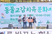 (누리일보) 고양특례시는 지난 25일 일산 문화광장에서 ‘2025 고양 동물교감치유 문화제’를 성황리에 개최했다고 밝혔다. 이번 행사는 10월 4일 ‘동물보호의 날’을 기념해 사람과 동물이 함께 행복한 도시문화를 확산하기 위해 마련됐다. 이날 기념식에서는 반려동물 복지문화 확산과 공공 반려동물 시설 운영에 기여한 동물단체에 대한 시장 감사장 수여식이 함께 진행됐다. 권지선 고양시농업기술센터 소장은 기념사를 통해 “10월 4일은 생명존중의 가치를 되새기며 모든 동물이 보호받아야 함을 기억하는 뜻깊은 날”이라며, “오늘 ‘2025 고양 동물교감치유 문화제’를 통해 사람과 동물이 서로의 마음을 이해하고 치유받는 따뜻한 시간을 보내시길 바란다. 고양시는 앞으로도 반려동물 복지환경을 지속적으로 개선하고, 시민과 반려동물이 함께 행복한 도시를 만들어가기 위해 최선을 다하겠다”라고 밝혔다. 이번 문화제는 고양 펫스타 패션쇼, 미용 교실, 펫 마사지 시연, 장애물 달리기(어질리티) 시범 및 체험, 달리기 게임 등 다채로운 프로그램과 함께 고양시 농산물 판매, 펫로스 증후군 상담, 동물 감정카드 체험, 반려동물 행
