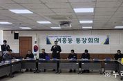 (누리일보) 여주시 여흥동은 8일 오전, 행정복지센터 2층 회의실에서 2026년 새해를 맞이하며 첫 통장회의를 개최했다. 회의에는 김영완 여흥동장, 박두형 여주시의회 의장, 서광범 도의원, 이병길 여주농협조합장 및 33개 마을 통장이 참석했다. 이날 회의는 2025년 적십자 모금 유공에 크게 기여하신 통장(멱곡2통, 연양1통) 시상식으로 시작하여, 2026년 새로 임명되신 신임 통장(점봉7통, 우만통) 임명장 수여, 팀별 소관사항 발표 및 건의사항 청취 순으로 진행됐다. 또한 지난 2년 동안 여흥동 발전을 위해 봉사해주신 윤영호 통장협의회장이 이임했고, 차기 여흥동 통장협의회를 이끌어갈 회장으로는 유창훈 홍문1통장이 결정됐다. 김영완 여흥동장은 “작년 한 해는 통장님들께서 주민과 행정을 잇는 가교 역할을 훌륭히 해주신 덕분에 성공적으로 마무리했다. 2026년 새해에도 여주의 중심 여흥동을 위해 적극적인 관심과 협조 부탁드리며, 지역발전과 주민화합에 앞장서 주시기 바란다.”라고 말했다. 유창훈 통장협의회장은 “앞으로 책임감을 가지고 주민들이 살기 좋은 여흥동을 만들기 위해 최선을 다하겠다.”라고 말했