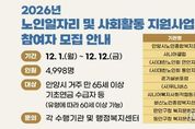 (누리일보) 안양시가 1일부터 12일까지 건강하고 활기찬 노후를 위한 ‘2026년 노인일자리 및 사회활동 지원사업’의 참여자 4,998명을 모집한다. 참여자 규모는 유형별로 ▲노인공익활동 3,155명 ▲노인역량활용 1,106명 ▲공동체사업단 574명 ▲취업지원 163명 등이다. 노인일자리사업의 수행기관은 ▲안양시노인종합복지관 ▲비산노인종합복지관 ▲안양시니어클럽 ▲만안·동안노인지회 ▲경기실버포럼 ▲(사)위니버스 ▲시니어복지사회적협동조합 ▲만안구청 ▲동안구청 등 10곳이며, 참여자는 수행기관에서 추진하는 다양한 일자리·사회활동에 참여하게 된다. 신청 자격은 공고일(11월 27일) 기준 안양시에 주민등록이 되어 있는 어르신이다. 세부 기준은 ▲노인공익활동은 65세 이상 기초연금·직역연금 수급자(배우자 포함) ▲노인역량활용은 65세 이상(일부 유형은 60세 이상) ▲공동체사업·취업지원은 60세 이상이다. 다만, 생계급여 수급자(취업지원 제외), 건강보험 직장가입자, 장기요양등급자 등 일부 대상자는 신청이 제한된다. 희망자는 신분증과 주민등록등본 등을 지참하고 해당 수행기관 또는 거주지 동 행정
