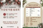 (누리일보) 구리시 여성행복센터는 12월 1일부터 12월 12일까지 2주간 ‘2025년 수강생 작품 전시 및 발표회’를 개최한다고 밝혔다. 이번 행사는 여성행복센터 행복동 1층에서 진행되며, 한 해 동안 수강생들이 갈고닦은 실력을 선보이는 자리다. 생활 속 문화예술 참여를 확대하고 시민의 문화 향유 기회를 높이는 동시에 여성행복센터 프로그램에 관한 관심을 높이기 위해 마련됐다. 전시장에는 양재 소품, 나만의 옷 만들기, 꽃꽂이, 가죽공예, 서양화, 한국화 등 총 9개 강좌에서 제작한 약 120점의 작품이 전시된다. 또한 플루트, 바이올린, 통기타 음악 강좌 수강생들의 발표 공연도 함께 진행되어 다채로운 즐길 거리를 제공할 예정이다. 백경현 구리시장은 “추워지는 연말, 여성행복센터 수강생들의 작품발표회가 시민들의 마음을 따뜻하게 채우는 시간이 되길 바란다”라고 전했다. 한편, 구리시 여성행복센터는 2025년에 5개 교육과정, 총 72개 강좌를 실시해 2,754명이 교육을 수료했으며, 2026년 1기 수강생 모집은 12월 15일부터 28일까지 진행될 예정이다. 자세한 사항은 여성행복센터 홈페이지에서 확