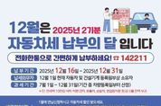 (누리일보) 평택시는 2025년 12월 정기분 자동차세 16만 5천 건에 대해 199억 원을 부과·고지하고 납부 기한 내 납부하도록 적극적인 홍보에 나섰다고 밝혔다. 자동차세는 연 2회(6월, 12월) 부과하는 정기분 세목으로, 이번 제2기분 자동차세 부과 대상은 과세기준일인 12월 1일 현재 평택시에 등록되어있는 자동차, 이륜차, 건설기계 등이며, 7월 1일부터 12월 31일까지의 보유기간에 대해 차량의 용도와 차종, 배기량, 차령에 따라 세액을 차등 적용하여 부과한다. 아울러, 연세액 10만 원 이하의 경차·화물차·승합차량은 6월에 전액 과세하나 6월 이후에 취득했다면 이번 제2기분 과세 대상에 포함되며, 자동차세를 연납한 차량은 이번 과세 대상에서 제외된다. 납부 기한은 12월 16일부터 31일까지이고, 고지서는 우편 발송되며 전자고지 신청자는 전자우편 또는 모바일 앱에서 확인이 가능하다. 납부는 ‘지방세입계좌’ 서비스를 통해 이체 수수료 없이 납부할 수 있으며, 이외에도 전국 금융기관 방문 혹은 은행 자동화기기(CD/ATM) 등에서도 고지서 없이 신용카드 또는 통장으로 납부할 수 있다. &n