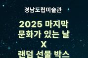 (누리일보) 경남도립미술관은 12월 31일 ‘문화가 있는 날’을 맞이해 연말을 함께 즐길 수 있는 특별 이벤트를 마련한다고 밝혔다. 이날 미술관은 전시실을 무료 개방하며, 관람 시간 또한 오후 8시까지 연장 운영된다. 오후 6시부터는 미술관을 찾은 관람객 중 선착순 30명에게 참여 기회가 주어지는 ‘행운권 추첨 이벤트’가 진행되며, 참여자에게는 랜덤 선물 박스 등 다양한 경품이 증정된다. 이번 행사는 ‘문화가 있는 날’을 통해 관람객이 미술관을 보다 가깝게 느끼고, 한 해를 예술과 함께 마무리할 수 있도록 기획됐다. 미술관 관계자는 “2025년을 함께 해준 지역민들에게 감사의 마음을 전하며, 작은 선물과 예술의 경험이 따뜻한 연말 추억이 되길 바란다”라고 전했다. 한편, 이번 야간 개장에서는 현재 진행 중인 환경을 주제로 한 체험형 전시《테라폴리스를 찾아서》와 함께《현대옻칠예술: 겹겹의 시간》도 관람가능하다.