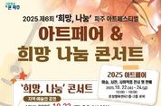 (누리일보) 파주시가 주최하고 ㈔한국예술문화단체총연합회 파주지회에서 주관하는 '2025 제6회 ‘희망, 나눔’ 파주 아트페스티벌'이 10월 22일부터 24일까지 3일간 운정행복센터에서 개최된다. 올해로 6회를 맞이한 이번 축제는 다양한 분야의 예술을 매개로 온정을 나누고 희망과 행복을 전하기 위해 마련됐으며, 축제를 통해 발생한 수익금은 어려운 이웃에게 전달되고 있다. 축제 기간 동안 운정행복센터에 파주예총 전문 예술인들의 미술, 사진, 시화 작품 등을 전시하고 판매하는 공간이 운영되며, 23일과 24일에는 지역 예술인 및 초청 가수(전원석, 이규석, 녹색지대)들의 공연 ‘희망, 나눔 콘서트’가 개최된다. 공연 시작 전에는 무료로 가족사진 찍어주기 행사가 진행될 예정이다. 유초자 문화예술과장은 “이번 축제가 어려운 환경에 있는 이웃에게 나눔을 전하는 계기가 되기를 소망한다”라며, “일상 속에서 예술을 가까이 만날 수 있는 이번 축제에 시민 여러분의 많은 관심과 참여를 바란다”라고 말했다.