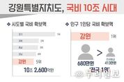 (누리일보) 강원특별자치도는 국비 확보 10조 시대에 진입한 가운데, 인구 1인당 국비 확보액이 약 680만 원으로 전국 1위에 해당한다고 밝혔다. 2026년도 강원특별자치도 국비 확보액은 총 10조 2,600억 원으로 경기, 경북, 충남, 경남에 이어 전국 시도 중 5위에 해당한다. - 이는 도보다 인구가 2배 이상 많은 인천(6조 4,000억 원)과 부산(10조 2,000억 원)보다 많은 수치이다. 특히 국비 총액을 인구수로 환산한 인구 1인당 국비 확보액은 약 680만 원으로 전국 평균 413만 원을 크게 웃도는 수치다. 도는 이번 국비 확보 성과가 정부 차원에서 도가 추진 중인 주요 사업의 필요성과 중요성에 대한 공감한 결과로 보고 있다. 도는 앞으로 국비가 단순한 규모에 그치지 않도록 사업 추진의 완성도와 체감 성과를 높이는 데 행정력을 집중할 계획이다. 김진태 지사는 “국비 10조 원이 체감되기 어려울 수 있지만 총 규모로는 전국 기준 5위, 도민 1인당으로 환산하면 약 680만 원으로 전국 1위에 해당한다”며, “확보된 국비가 현장에서 차질없이 집행돼 도민이 체