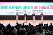 (누리일보) 대전시는 12일 시청 대강당에서 대전광역시의회, 대전충남 행정통합 민관협의체(이하 민관협)와 공동으로 “대전충남 행정통합 설명회 및 시민 한마음 촉구대회”를 개최하고, 대전충남 행정통합 특별법안의 조속한 국회 심의․의결을 촉구했다. 이날 행사는 최근 대통령이 행정통합의 필요성을 공식 언급하면서 통합 논의가 새로운 전기를 맞은 가운데 마련됐으며, 약 600명의 시민이 참석해 추진상황을 공유하고 통합 의지를 결집했다. 이창기 민관협 공동위원장은 지난 10월 2일 특별법안 발의 이후 경과를 소개하며, 통합으로 기대되는 효과를 설명했다. 이 공동위원장은 통합 시 인구 360만 규모의 초광역 혁신 클러스터 형성, 광역교통․생활권 확장 등 실질적인 변화를 강조하며 “행정통합은 수도권 일극체제에 대응할 충청권의 경쟁력 확보 전략”이라고 밝혔다. 설명회 후에는 통합을 촉구하는 퍼포먼스가 진행됐다. 이장우 대전시장, 조원휘 대전시의회의장, 이창기 민관협 공동위원장, 남재동 대전사랑시민협의회장이 관객석에서 행정통합을 촉구하는 구호를 선창하고 시민이 후창하는 카드섹션을 펼쳤으며, 이어 무대에서는 통합 결의