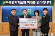 (누리일보) 전북특별자치도는 20일 도청에서 ㈜엔라인이 운영하는 온라인 여성의류 쇼핑몰 ‘난닝구닷컴’의 의류 기탁식을 개최했다. 이날 기탁식에는 김관영 도지사와 이정민 ㈜엔라인 대표, 전북사회복지공동모금회 한명규 회장 등이 참석해 기탁 물품을 전달하고 나눔의 의미를 함께 나눴다. 이번에 기탁된 물품은 의류 2,611벌(약 1억 원 상당)로, 전북사회복지공동모금회를 통해 도내 저소득 세대와 사회복지시설 등 지원이 필요한 현장에 순차적으로 전달될 예정이다. 도는 현장 수요를 면밀히 반영해 배분 과정에서 지원 공백이 발생하지 않도록 관리하고, 기업과 지역사회가 함께하는 민관 협력을 더욱 확대해 취약계층 의생활 지원을 강화해 나갈 방침이다. 노홍석 전북자치도 행정부지사는 “기업의 자발적인 나눔이 지역사회에 큰 힘이 되고 있다”며 “기탁 물품이 꼭 필요한 이웃에게 신속하고 공정하게 전달될 수 있도록 도에서도 책임 있게 뒷받침하겠다”고 밝혔다. 이정민 ㈜엔라인 대표는 “이번 기탁이 도움이 필요한 이웃들의 일상에 작은 보탬이 되길 바란다”며 “앞으로도 지역사회와 함께하는 나눔을 지속적으로 이어가겠다