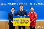 (누리일보) 광주은행은 26일 전남도청에서 열린 ‘광주·전남愛사랑카드 고향사랑 기부금 전달식’에 참석해 전남지역 복지사각지대 해소를 위한 고향사랑기부금 6,360만 원을 전달했다고 밝혔다. 이날 전달식에는 김종민 광주은행 부행장과 강위원 전라남도 경제부지사, 김동극 전남사랑의열매 사무처장을 비롯한 관계자들이 참석해 지역사회 상생을 위한 뜻을 함께했다. 이번 기부금은 광주은행의 사회공헌형 금융상품인 ‘광주·전남愛사랑카드’ 이용 금액의 일부로 조성됐다. 광주은행은 앞서 지난 12월 1일에도 광주지역에 9,578만원의 고향사랑기부금을 전달하는 등 지속적인 지역 나눔을 실천하고 있다. ‘광주·전남愛사랑카드’는 광주은행이 2018년 창립 50주년을 기념해 출시한 상품으로, 카드 수익의 일부를 고객이 지정한 광주·전남사회복지공동모금회에 기부하는 구조로 이뤄진다. 이를 통해 지역경제 선순환에 기여하고 있으며, 출시 이후 현재까지 광주·전남 지역에 약 20억 원의 기부금을 전달했다. 김종민 광주은행 부행장은 “광주·전남愛사랑카드에 보내주신 고객들의 성원과 고향사랑 실천 덕분에 뜻깊은 기