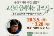 (누리일보) 김포시 통진도서관은 고전 중심의 독서법과 글쓰기를 알려주는 야간 인문학 프로그램 ‘고전과 함께하는 글쓰기’를 오는 3월 5일부터 3월 26일까지 매주 목요일 오후 7시에 통진도서관 세미나실에서 운영한다고 밝혔다. '고전 한 책 깊이 읽기'의 저자 이권우는 ‘고전과 함께하는 글쓰기’를 통해 맹자의 철학과 중용을 깊이 있게 다루며, 책을 읽으면서 생각을 확장하는 독서법과 단락 중심의 글을 쓰는 방법을 총 4회차에 걸쳐 진행한다. 회차별 주제는 ▲고전 속 맹자의 철학 ▲맹자가 알려주는 우리 시대의 관계성 ▲글쓰기가 쉬워지는 독서법 ▲글쓰기의 첫걸음이다. 참여를 원하는 경우 오는 2월 10일 오전 10시부터 통진도서관 누리집 또는 전화로 신청할 수 있으며, 고전과 글쓰기에 관심있는 성인 20명을 선착순으로 모집한다.