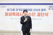 (누리일보) 화성특례시의회는 26일 화성종합경기타운 3층 라운지홀에서 열린 제72회 경기도체육대회 화성시 선수단 결단식에 참석해 선수단을 격려하고 4연패 달성을 위한 결의를 다졌다. 이날 행사에는 배정수 의장을 비롯해 김종복 문화복지위원장, 송선영·이용운 의원, 화성시체육회 임원과 종목단체 관계자, 선수단 등 약 150여 명이 참석했다. 이날 결단식은 경기도체육대회 출전을 앞둔 선수단의 사기를 높이고 각오를 다지는 자리로 마련됐다. 화성특례시 선수단은 오는 4월 16일부터 18일까지 광주시 일원에서 열리는 제72회 경기도체육대회에 출전한다. 육상, 수영, 축구 등 27개 종목에 참가해 종합우승 4연패에 도전한다. 배정수 의장은 “묵묵히 쌓아온 훈련의 시간과 노력을 믿고 끝까지 당당하게 경기에 임해주시기 바란다”며 “선수 여러분의 땀과 투혼이 화성특례시의 자부심”이라고 말했다. 이어 “화성특례시의회도 선수들이 오직 경기에 집중할 수 있도록 체육 환경 조성과 지원에 최선을 다하겠다”며 “4연패 달성을 진심으로 기원한다”고 덧붙였다. 화성특례시의회는 선수들이 충분한 기량을 펼칠