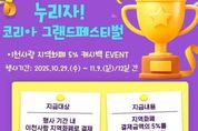 (누리일보) 이천시는 행정안전부 주관 ‘2025 코리아그랜드페스티벌(KOREA GRAND FESTIVAL)’에 맞춰 지역화폐 이용을 촉진하고 지역 상권을 활성화하기 위한 ‘이천사랑 지역화폐 캐시백 5% 이벤트’를 추진한다고 밝혔다. 이번 행사는 10월 29일부터 11월 9일까지 12일간 전국에서 동시에 개최되는 코리아그랜드페스티벌 소비촉진 캠페인의 하나로, 이천시는 국비 1억 5천만 원을 확보해 사용자 충전금으로 결제한 금액에 한정해 결제금액의 5%를 적립금(인센티브, 정책수당 등으로 충전된 금액 사용분은 지급 대상에서 제외)으로 지급한다. 이용자는 이천사랑지역화폐를 통해 1인당 최대 20,000원까지 5% 적립금을 받을 수 있으며, 별도의 신청 절차 없이 자동으로 지급된다. 지급된 적립금의 사용 유효기간은 5년이며, 이천시 지역화폐 가맹점에서 자유롭게 사용이 가능하다. 이천시는 이번 행사를 통해 시민의 실질적인 소비 혜택과 지역 상권 활성화를 동시에 도모할 계획이다. 김경희 이천시장은 “코리아그랜드페스티벌 이천사랑지역화폐 캐시백 이벤트를 통해 지역 소비가 활발히 이어지고, 소상공인 매출 회복의 기회가 되길 바