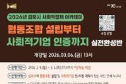 (누리일보) 김포시가 사회문제 해결을 위한 참신한 아이디어와 실행력을 갖춘 사회적경제기업 육성을 위해 ‘2026년 김포시 사회적경제 아카데미’를 개설하고, 오는 3월 3일까지 수강생을 모집한다. 이번 아카데미는 평소 사회적경제에 관심 있는 김포시민은 물론, 연내 협동조합 설립과 사회적기업 인증을 준비 중인 관내 기업, 단체라면 누구나 신청할 수 있다. 교육 과정은 ▲사회적기업 개념 및 인·지정 요건 ▲협동조합 개념, 설립 절차 및 인가 요건 ▲2026년 지원제도 등 사회적경제에 대한 기본 개념을 습득하고, 연내 진입을 위한 사전 준비가 가능하도록 실전형으로 구성했다. 특히 전문가 1:1 멘토링을 통해 ▲사업 아이템의 경쟁력 및 지속가능성 진단 ▲정관, 사업계획서 등 필수서류 작성 ▲심사 및 현장실사 대비 전략 등 기업 맞춤형 컨설팅이 후속으로 지원될 예정이다. 수강신청은 3월 3일까지 온라인으로 가능하며, 자세한 사항은 김포시청 홈페이지를 참조하거나 김포시청 지역경제과로 문의하면 된다. 김포시는 ‘일자리창출을 위한 재정지원’을 비롯해 ‘전략모델 개발비’, ‘교육·컨설팅’, ‘공공·민간